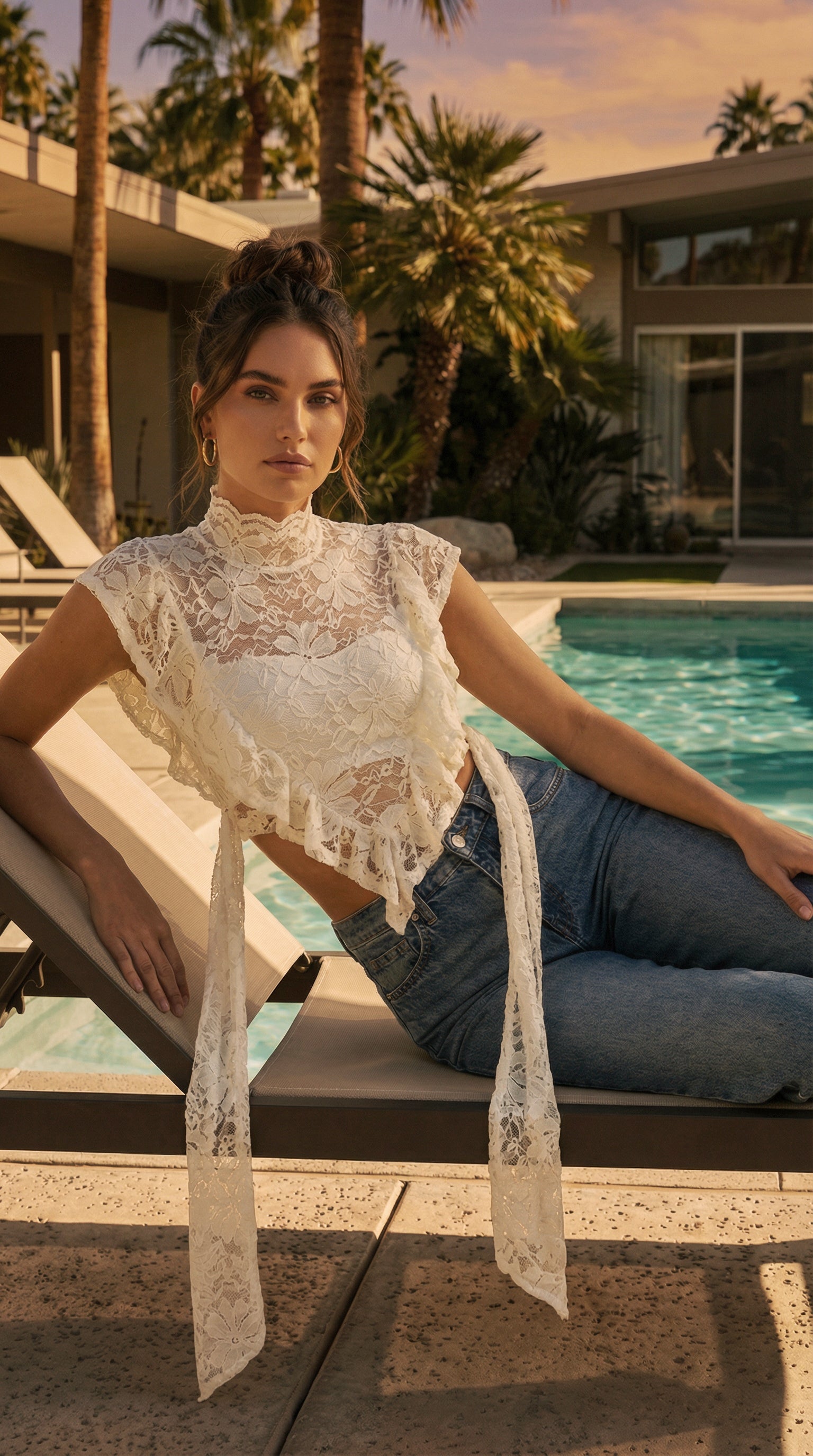 The Fleur Lace Apron Blouse combines elegance with everyday comfort. Featuring delicate lace crafted in Paris, this piece showcases a built-in supportive bra with elastic backing for a secure fit. Easy pull-on design with button closures and adjustable tie sides lets you customize your look. Pair it with jeans for casual sophistication or match it with our lace palazzo pants for a coordinated, head-to-toe ensemble. Soft, durable, and stretchy—designed for effortless style from day to night.