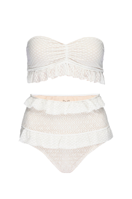 Our Flirtini Lace Bikini is so flattering on. Our lace swimwear is stretch, comfortable and waterproof! This two piece bikini conceals and reveals in all the right places. The bikini top features an adorable ruffle to match the mesh lace ruffles on our high waisted lace bottoms. LIMITED EDITION