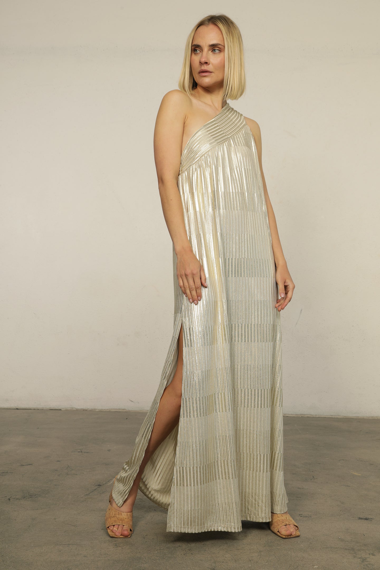 Indulge in the ultimate combination of comfort and elegance with our Grecian Lamé One Shoulder Gown. Made with our Super Drapey Lamé Viscose, this dress will make you feel like a goddess. Its one shoulder design paired back with glamorous gold jewelry make it the most effortless look for any special occasion. Perfect for resort, take away, special events and more.