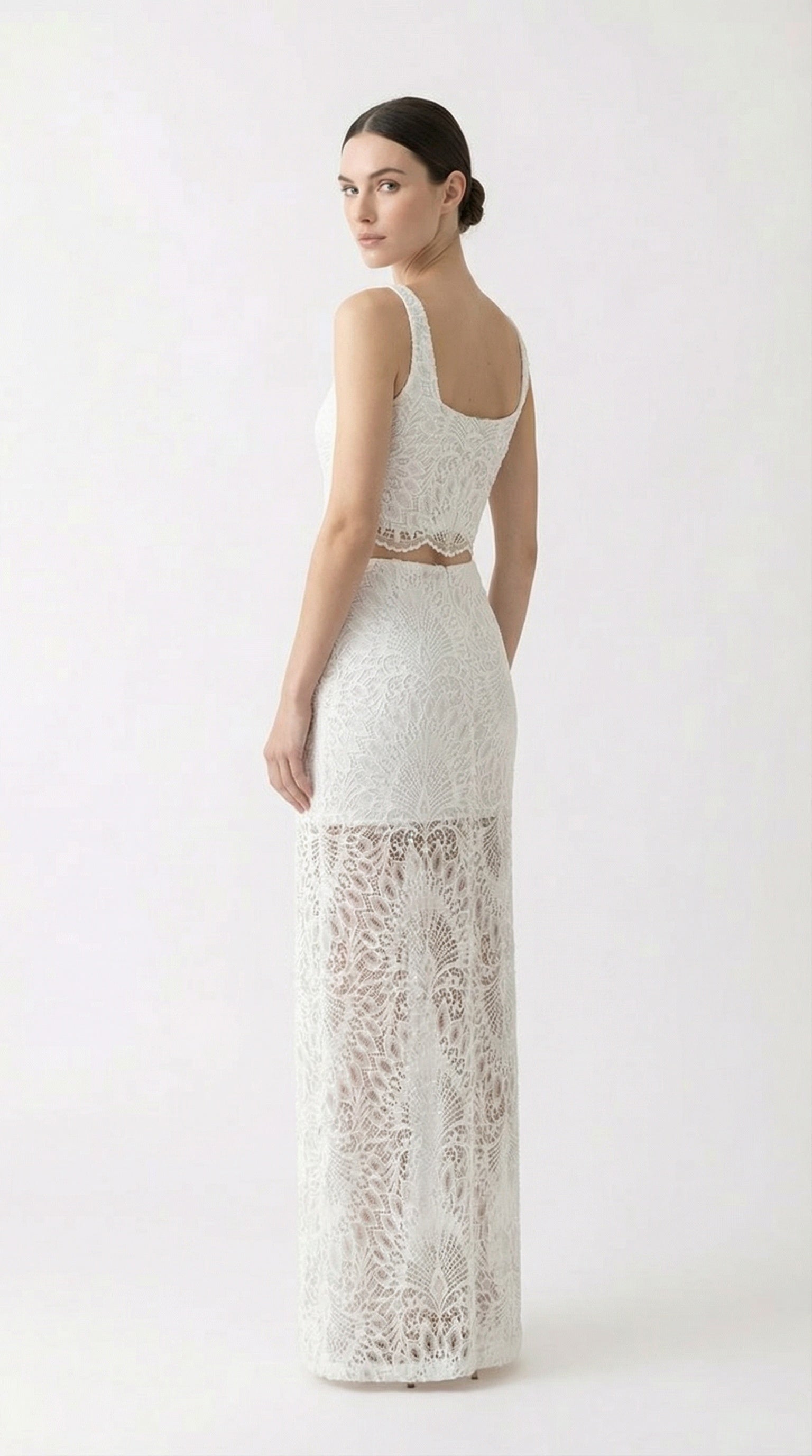 The High Slit Lace Maxi Skirt in Lanai lace is your go-to piece for effortless versatility. Dress it up with the matching lanai lace tank for a sultry cocktail moment, or keep it casual paired with an off-the-shoulder sweatshirt. The high slit adds movement and edge to this timeless silhouette—throw it on and go.