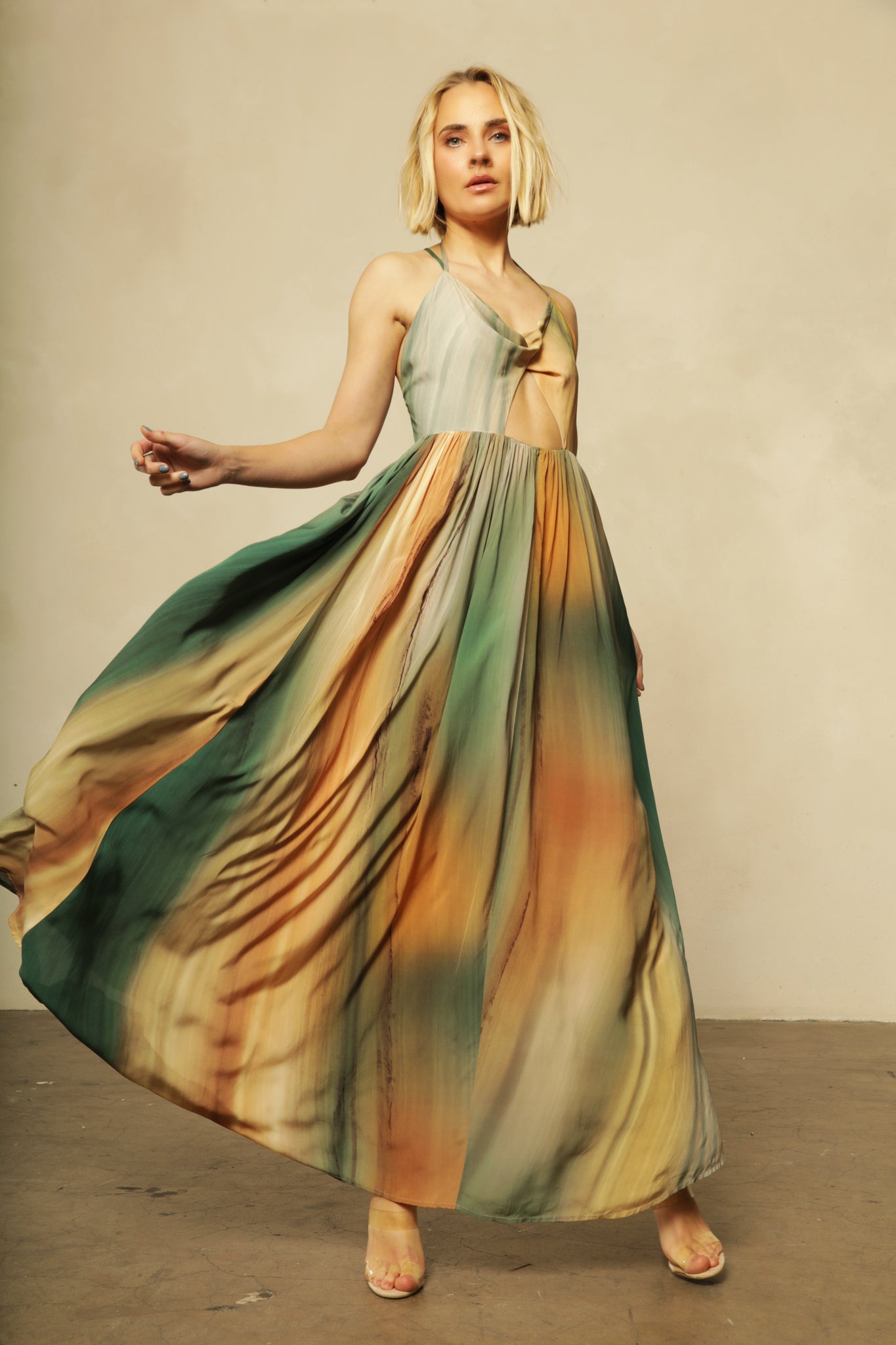Indulge in luxury with our Nightcap Watercolor Maxi. Crafted from a silk-like, hand dyed and printed viscose, each piece boasts a one-of-a-kind watercolor effect. The ultimate spring staple, this dress will make you feel stunning. Perfect for vacations, weddings, and special events.