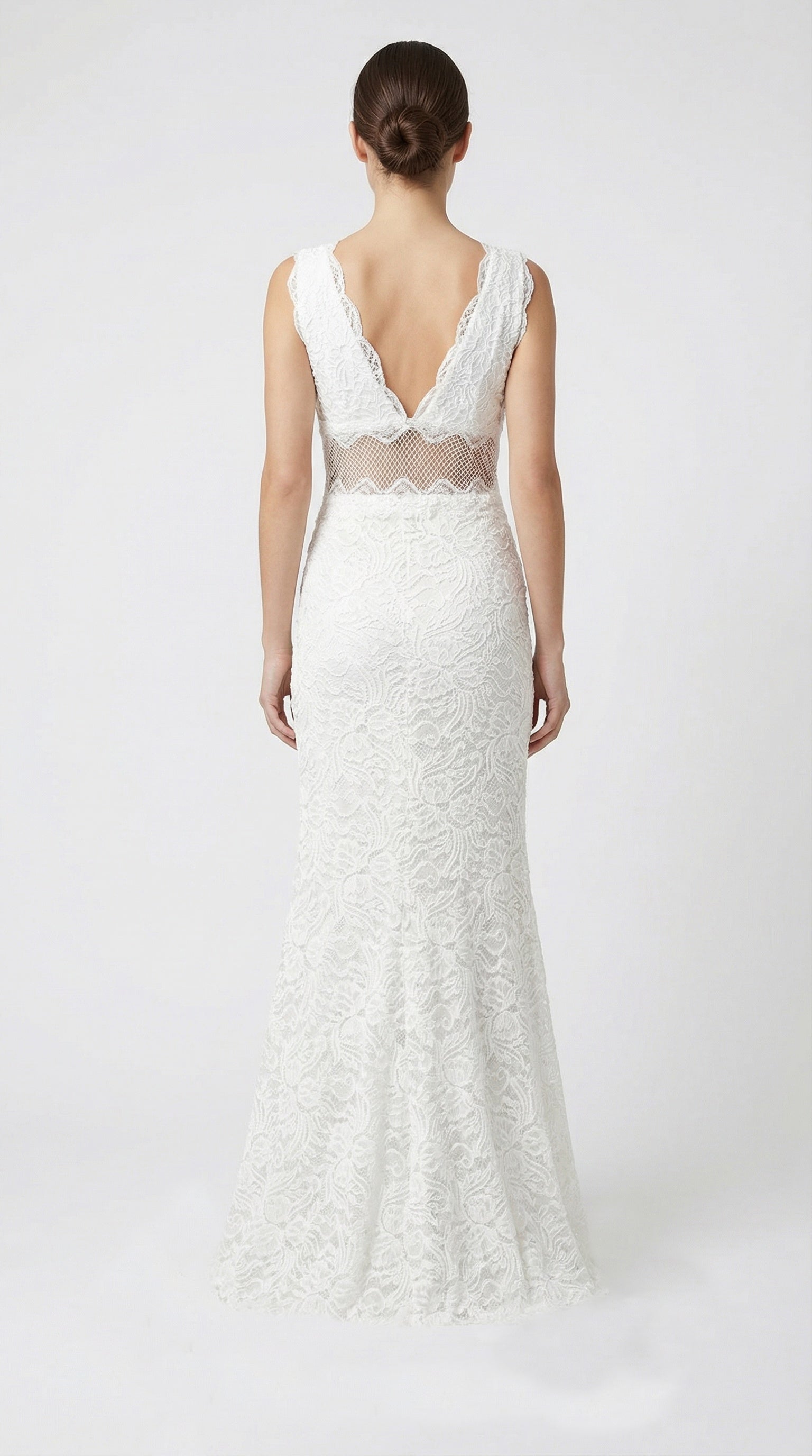 The Perfect Plunge Maxi features a sophisticated plunging neckline accentuated with delicate scallop trim, blending elegance with comfort. Crafted from fully stretchable French lace fabric, it drapes effortlessly like a nightgown, while our sheer lace and intricate fishnet trim detail adds a refined, ethereal touch.